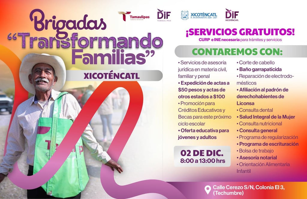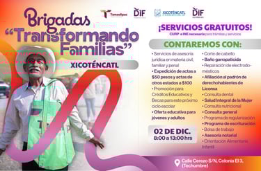 El Gobierno Municipal de Xicoténcatl invita a la ciudadanía a participar en las Brigadas “Transformando Familias”, un programa que acerca trámites y servicios totalmente gratuitos para apoyar la economía y el bienestar de las familias del municipio.