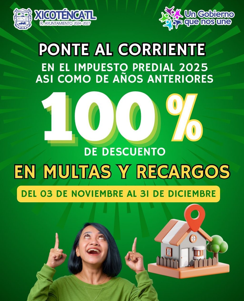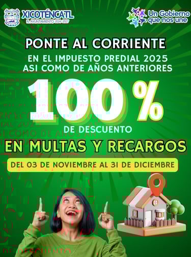 El Gobierno Municipal de Xicoténcatl 2024-2027 invita a todos los contribuyentes a aprovechar el 100% de descuento en multas y recargos al ponerse al corriente en el Impuesto Predial 2025, así como de años anteriores.