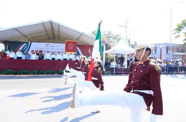 Ciudad Victoria, Tamaulipas.- Con la presentación, por primera vez, de una banda de guerra monumental integrada por 500 alumnos y alumnas de diferentes municipios, este jueves se conmemoró el desfile cívico, deportivo y militar, con la entusiasta participación de estudiantes, jóvenes, niñas y niños, en conmemoración del 115 aniversario del inicio de la Revolución Mexicana, presidido por el gobernador Américo Villarreal Anaya.