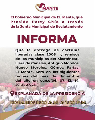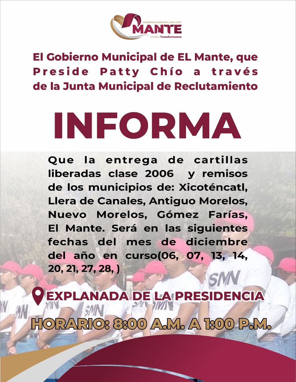 La Junta Municipal de Reclutamiento dará inicio a la entrega de cartillas liberadas clase 2006 y remisos para los municipios de: