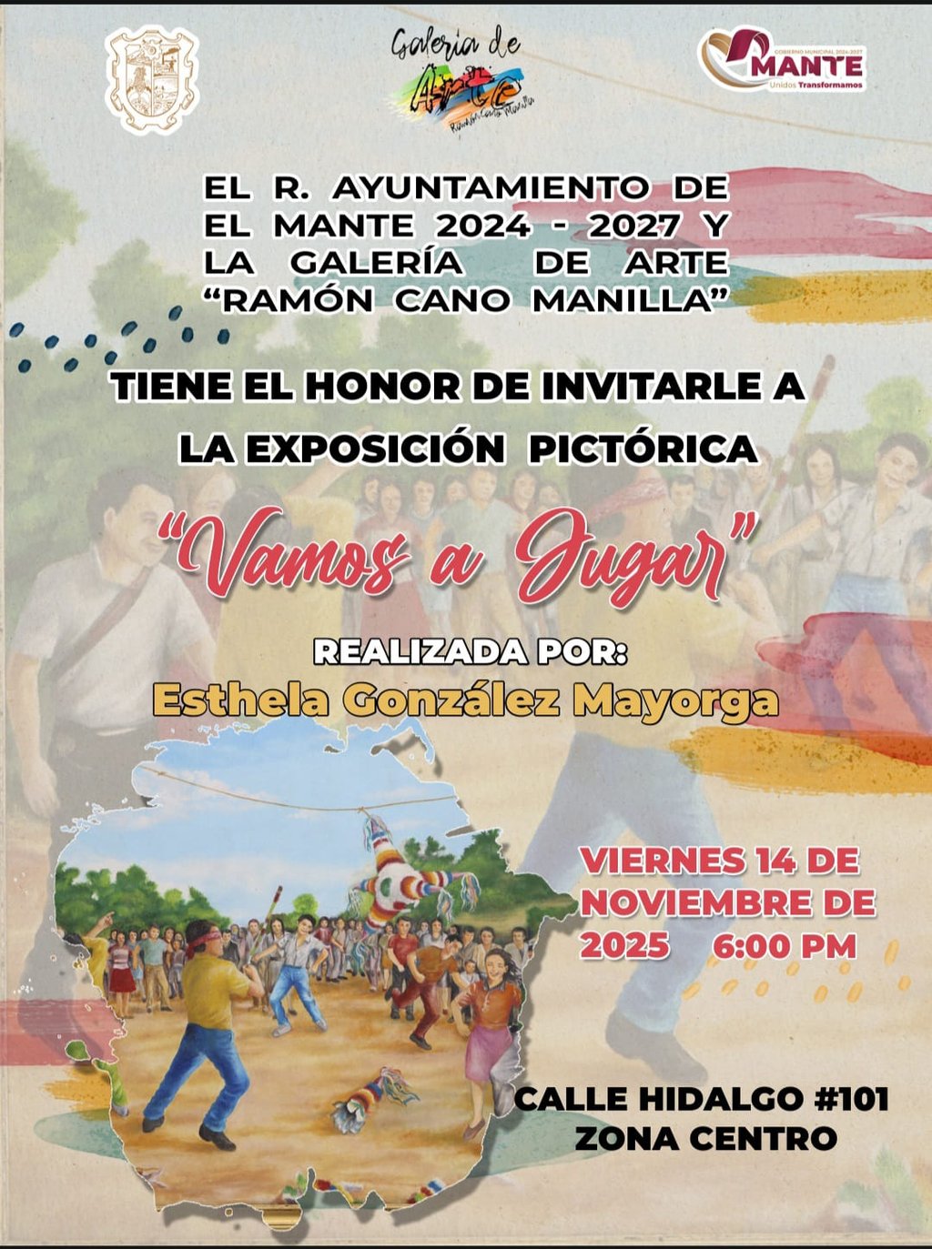 El Gobierno Municipal El Mante 2024-2027 y la Galería de Arte "Ramón Cano Manilla" te invitan a la Exposición Pictórica "Vamos a Jugar", de la artista pictórica Esthela González Mayorga.