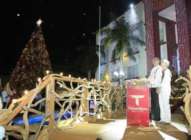 Ciudad Victoria, Tamaulipas.- En medio de una gran fiesta que culminó con el encendido del monumental pino navideño, el gobernador Américo Villarreal Anaya, junto a la presidenta del DIF Estatal, doctora María de Villarreal, deseó a las familias tamaulipecas que esta sea la mejor de las celebraciones y estén llenas de paz, reflexión y una visión humanista para poder seguir avanzando y progresando con bienestar.