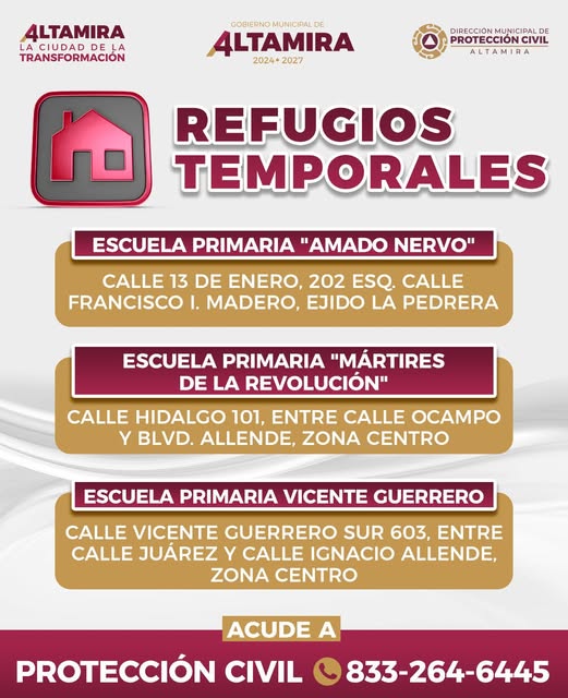 Conoce los Refugios Temporales que el Gobierno de Altamira ha dispuesto ante las condiciones climatológicas.