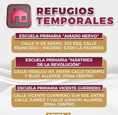 Si estás en riesgo o sabes de alguien que lo esté llama al 833 2646445 o acude directamente a estos refugios temporales en donde serás atendido.