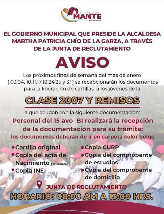El Gobierno Municipal El Mante 2024-2027 , que preside Patty Chio , a través de la Junta de Reclutamiento, informa que :
