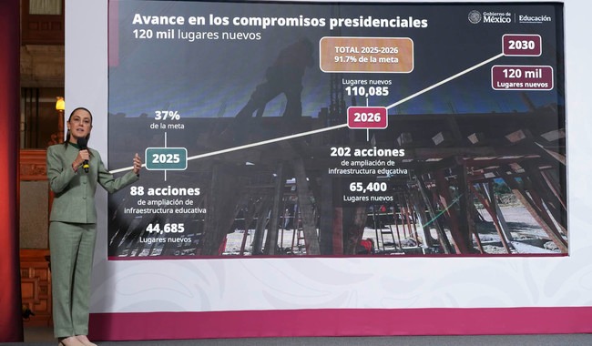 “¿Qué vamos a hacer en el 2026? 65 mil 400 nuevos lugares, es decir, 44 mil 685 más 65 mil 400 con 202 acciones de ampliación; ¿cómo? nuevos planteles, ampliación de planteles existentes y con esto que se llaman los telebachilleratos que le estamos dando una renovación de manera muy importante todos van a estar conectados a internet y están teniendo nuevos esquemas de formación y de enseñanza. De esta manera vamos a cumplir con que haya una preparatoria que quede cerca de la casa”, destacó en la conferencia matutina: “Las mañaneras del pueblo”.