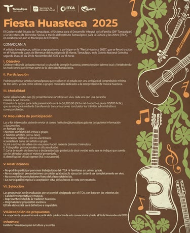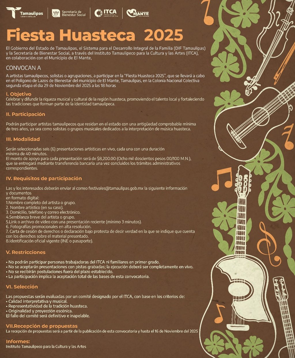 El Gobierno del Estado de Tamaulipas, el Instituto Tamaulipeco para la Cultura y las Artes en coordinación con el Gobierno Municipal El Mante y DIF El Mante CONVOCAN a participar en la FIESTA HUASTECA 2025, dirigida a artistas tamaulipecos, solistas y agrupaciones.