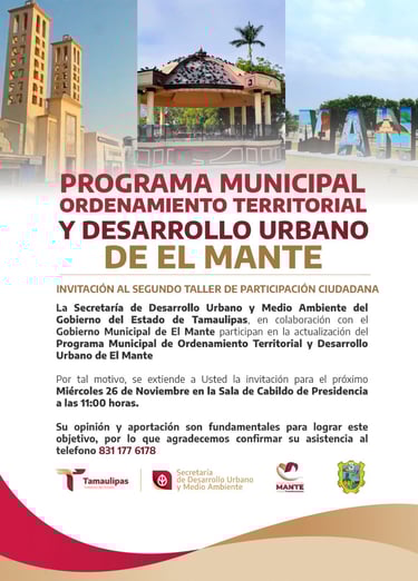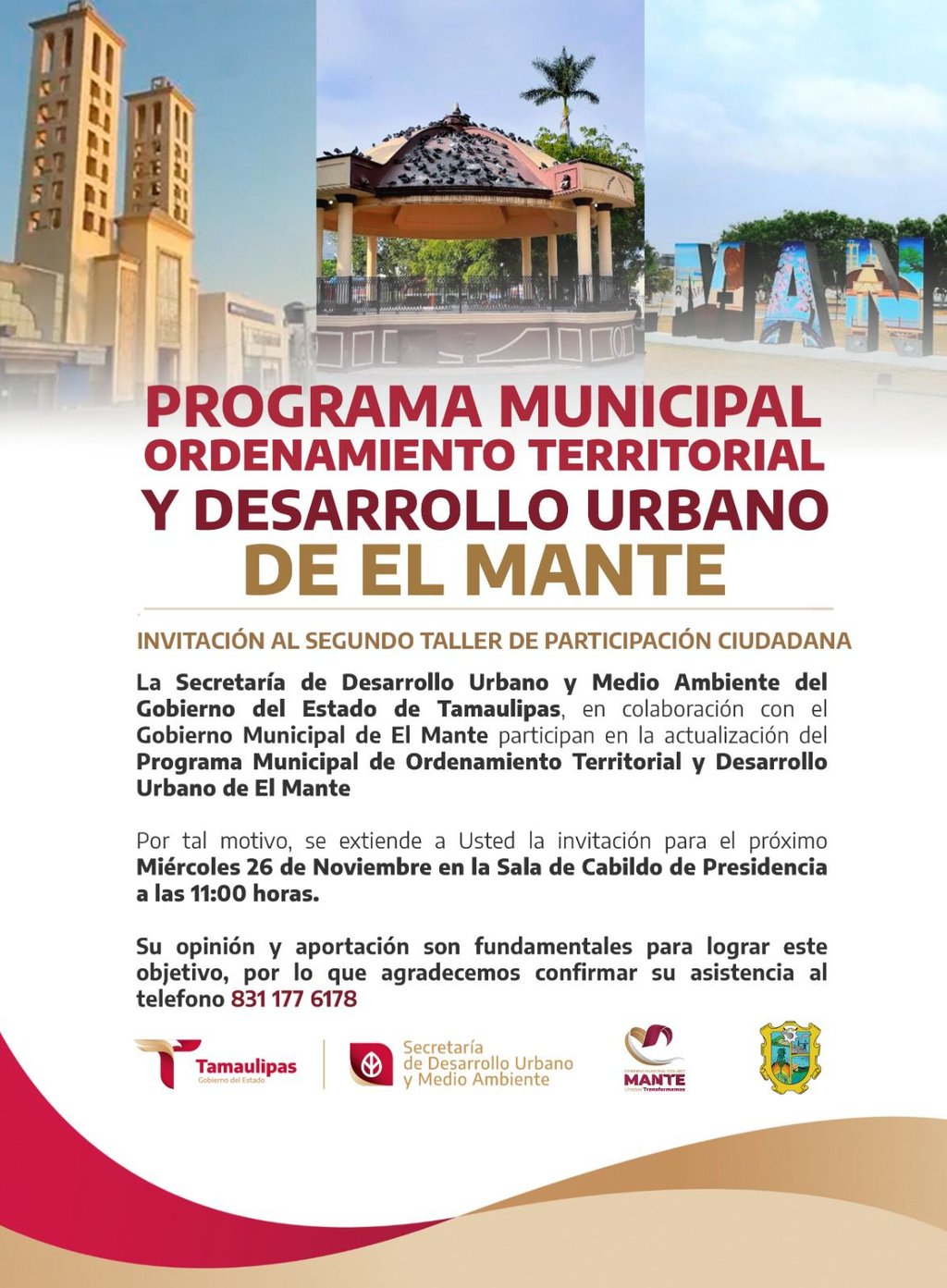 El Gobierno del Estado de Tamaulipas , a través de la Secretaría de Desarrollo Urbano y Medio Ambiente , en coordinación con el Gobierno Municipal El Mante 2024-2027 , continúa con los trabajos de actualización del Programa Municipal de Ordenamiento Territorial y Desarrollo Urbano de El Mante.
