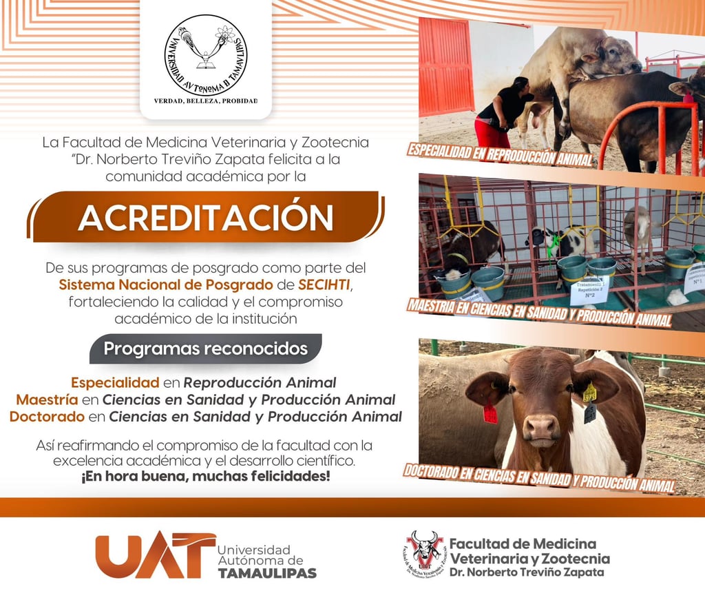 La Facultad de Medicina Veterinaria y Zootecnia “Dr. Norberto Treviño Zapata” de la Universidad Autónoma de Tamaulipas (UAT, reconoce y felicita a su comunidad académica por la acreditación de los programas de posgrado de la institución, otorgada por el Sistema Nacional de Posgrados de la secretaria de Ciencia, Humanidades, Tecnología e Innovación, con una vigencia de tres años, lo que representa un importante logro académico para la Facultad.