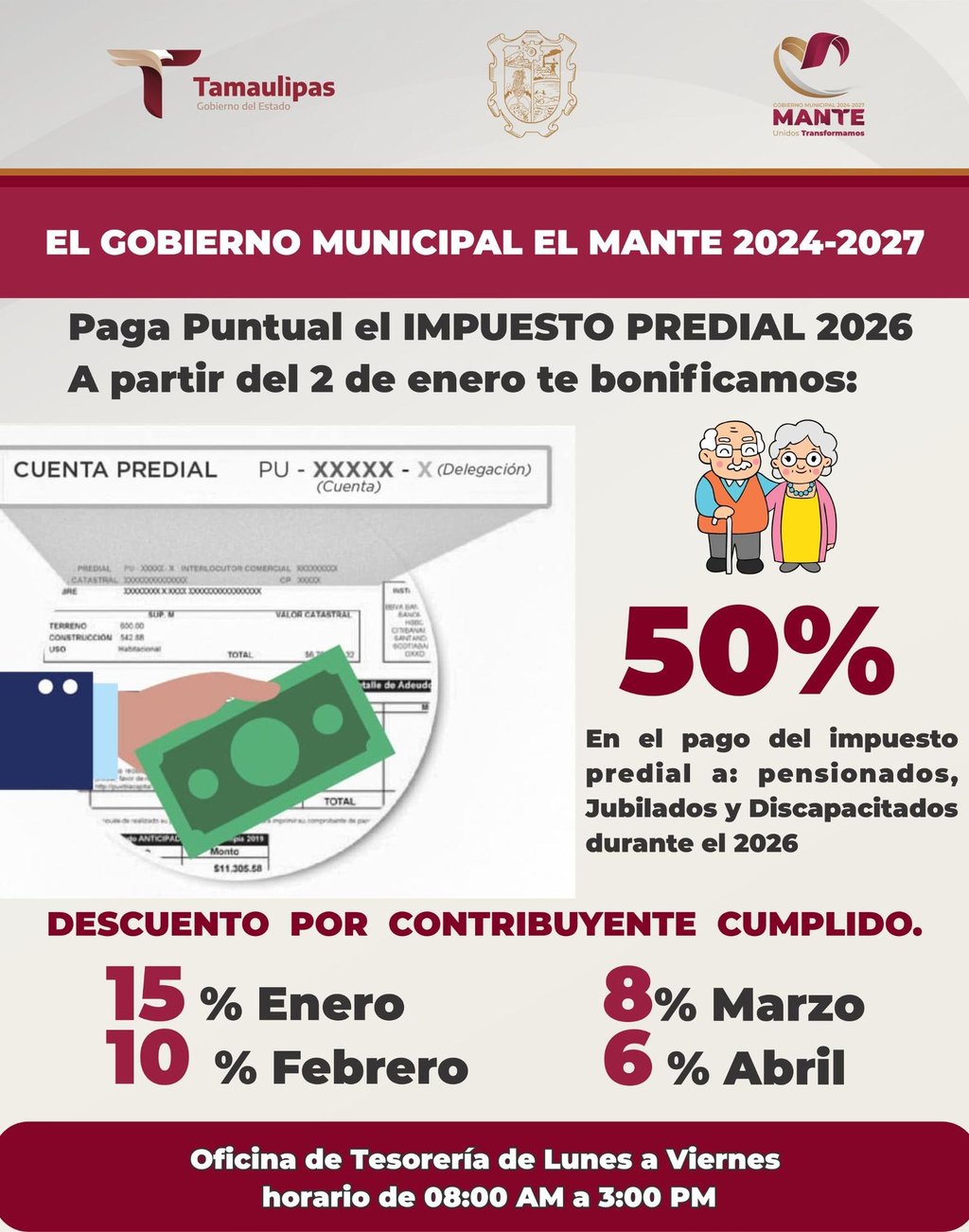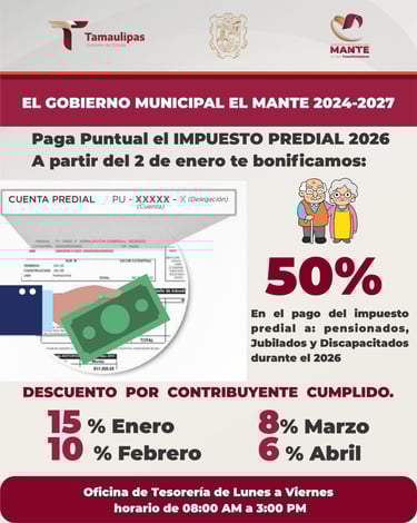 OTORGARÁ GOBIERNO MUNICIPAL DE EL MANTE DESCUENTOS ESPECIALES EN EL PAGO DEL PREDIAL 2026