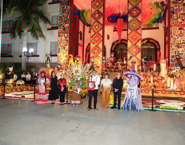 Este año el altar monumental elaborado por artesanos tamaulipecos que se ubica en las escalinatas de Palacio de Gobierno luce gigantescas figuras de catrinas, alebrijes, tapetes multicolores, flor de cempasúchil y cientos de imágenes de tamaulipecos y tamaulipecas que ya no están entre nosotros, las cuales fueron enviadas por sus familiares.