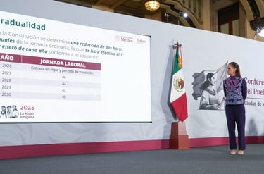 La Presidenta de México, Claudia Sheinbaum Pardo, anunció que, luego de un consenso con los sectores empresarial, sindical, académico, gubernamental y con la sociedad civil, enviará al Senado de la República el proyecto de reforma para que, a partir del 2026, se implemente de forma gradual la jornada laboral de 40 horas, reduciendo dos horas por año hasta concretar en el 2030, con lo que se beneficiará a 13.4 millones de personas trabajadoras.