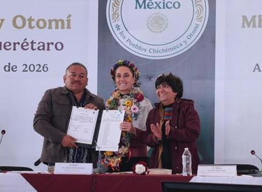 En San Miguel de Allende, Guanajuato, la Presidenta Claudia Sheinbaum Pardo encabezó la entrega de la documentación agraria que reconoce la creación del Ejido Nuevo Cruz del Palmar, que representa una solución pacífica a un conflicto de 80 años y que forma parte del Plan de Justicia de los Pueblos Chichimeca y Otomí del Noreste de Guanajuato y Semidesierto de Querétaro.