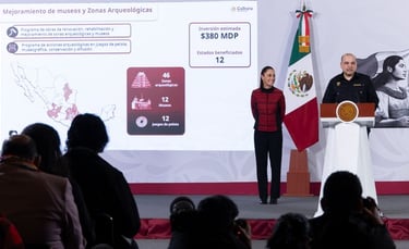La Presidenta de México, Claudia Sheinbaum Pardo, destacó que se avanza en la rehabilitación de mil 405 espacios de las escuelas del Instituto Nacional de Bellas Artes y Literatura (INBAL) y de 220 del Instituto Nacional de Antropología e Historia (INAH) con una inversión de mil 500 millones de pesos (mdp), así como la inversión de 380 mdp para mejoramiento de 12 museos y 46 zonas arqueológicas de 12 entidades de la República.