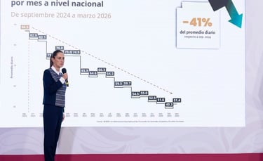 La titular del Secretariado Ejecutivo del Sistema Nacional de Seguridad Pública, Marcela Figueroa Franco, detalló que los homicidios dolosos disminuyeron 41 por ciento al pasar de un promedio diario de 86.9 en septiembre de 2024 a 51.4 en marzo de 2026. Esto representa 35 homicidios diarios menos y posiciona a marzo de este año como el más bajo desde el 2016. Agregó que, además, el primer trimestre del 2026 es el más bajo desde 2016 con un promedio diario de 50.8 en los tres primeros meses del año.
