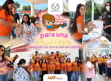 " Con el objetivo de brindar apoyo y esperanza a niñas que enfrentan tratamientos oncológicos, la Universidad Autónoma de Tamaulipas (UAT), a través de su Preparatoria No. 3 de Ciudad Victoria, llevó a cabo una jornada de donación de trenzas de cabello como parte de la campaña permanente “Para una Princesa". "