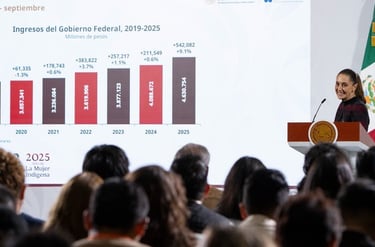 La Presidenta de México, Claudia Sheinbaum Pardo, resaltó que la recaudación de enero a septiembre de 2025 asciende a los 4.6 billones de pesos (bdp), lo que representa 542 mil millones de pesos (mdp) más que en 2024, lo cual demuestra que las mexicanas y mexicanos tienen confianza en que los recursos se utilizan de manera transparente y honesta.