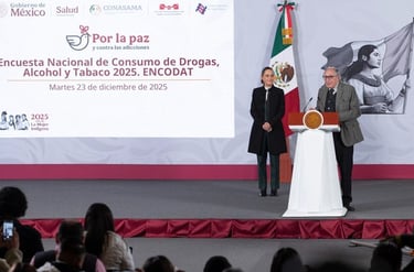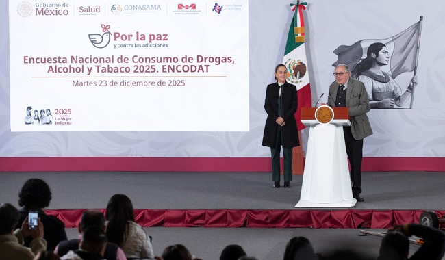 La Presidenta de México, Claudia Sheinbaum Pardo, resaltó que los resultados de la Encuesta Nacional de Consumo de Drogas, Alcohol y Tabaco (ENCODAT) 2025, que realizó el Instituto Nacional de Salud Pública (INSP) de la Secretaría de Salud, demuestran que es exitosa la campaña preventiva, nacional y permanente Aléjate de las drogas. El fentanilo te mata, ya que el consumo no médico de este opioide disminuyó de 0.2 a 0.1 por ciento, mientras que el uso experimental de drogas ilegales en adolescentes se redujo del 6.2 por ciento en 2016 a 4.1 por ciento en 2025.