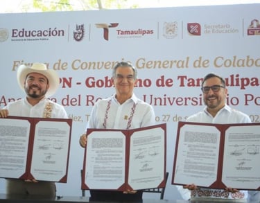 González, Tamaulipas. – El gobernador Américo Villarreal Anaya firmó el convenio de colaboración con el Instituto Politécnico Nacional e inauguró el Recinto Universitario Polivirtual, una nueva plataforma académica con la calidad y la excelencia educativa que distingue a esta prestigiada institución y que, por primera vez, se pone en marcha en todo el país.