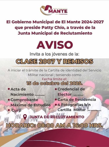 Los interesados pueden acudir a la Junta Municipal de Reclutamiento del Gobierno Municipal El Mante 2024-2027 en horario de 8:00 a 16:00 horas.