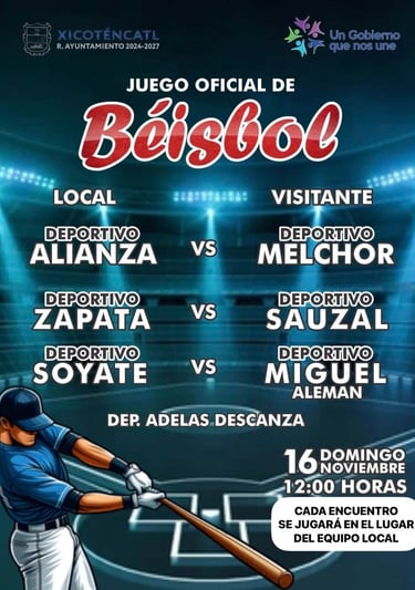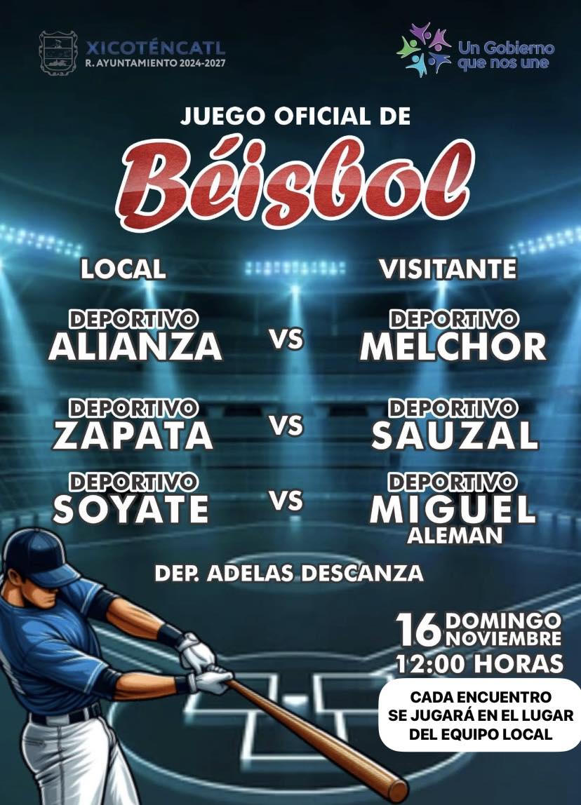 El Gobierno Municipal de Xicoténcatl, encabezado por Mariela López Sosa Presidenta Municipal, continúa promoviendo el deporte y la convivencia familiar con los juegos oficiales de béisbol este domingo 16 de noviembre, a las 12:00 horas, los encuentros se llevaran a cabo en el campo perteneciente a cada equipo local.