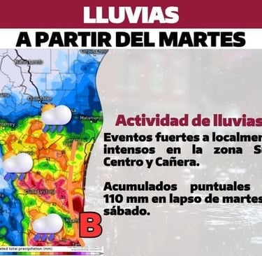Zona centro: Eventos fuertes, con acumulados de 70 a 90 mm y puntuales de 100 a 110 mm. Y en la zona cañera y sur: Eventos fuertes a localmente intensos, con acumulados de 80 a 100 mm y puntuales de 110 a 120 milímetros.